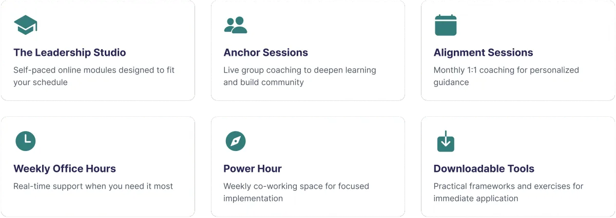 Through a blend of self-paced modules, live coaching, and peer connection, you’ll gain practical tools, emotional support, and the mindset shifts needed to lead more effectively, sustainably, and authentically.